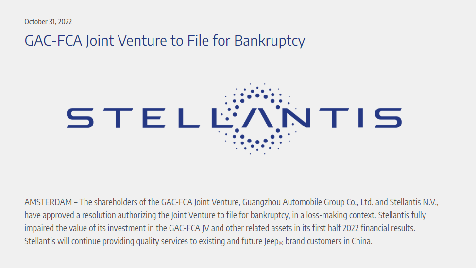 2023年2月6日Stellantis集团发文称,鉴于广汽菲克已申请破产,合资公司目前已无法保障国产及进口Jeep、菲亚特品牌车辆的日常维保及售后服务。Stellantis中国决定自今日起提供上述车辆的维保及售后服务。